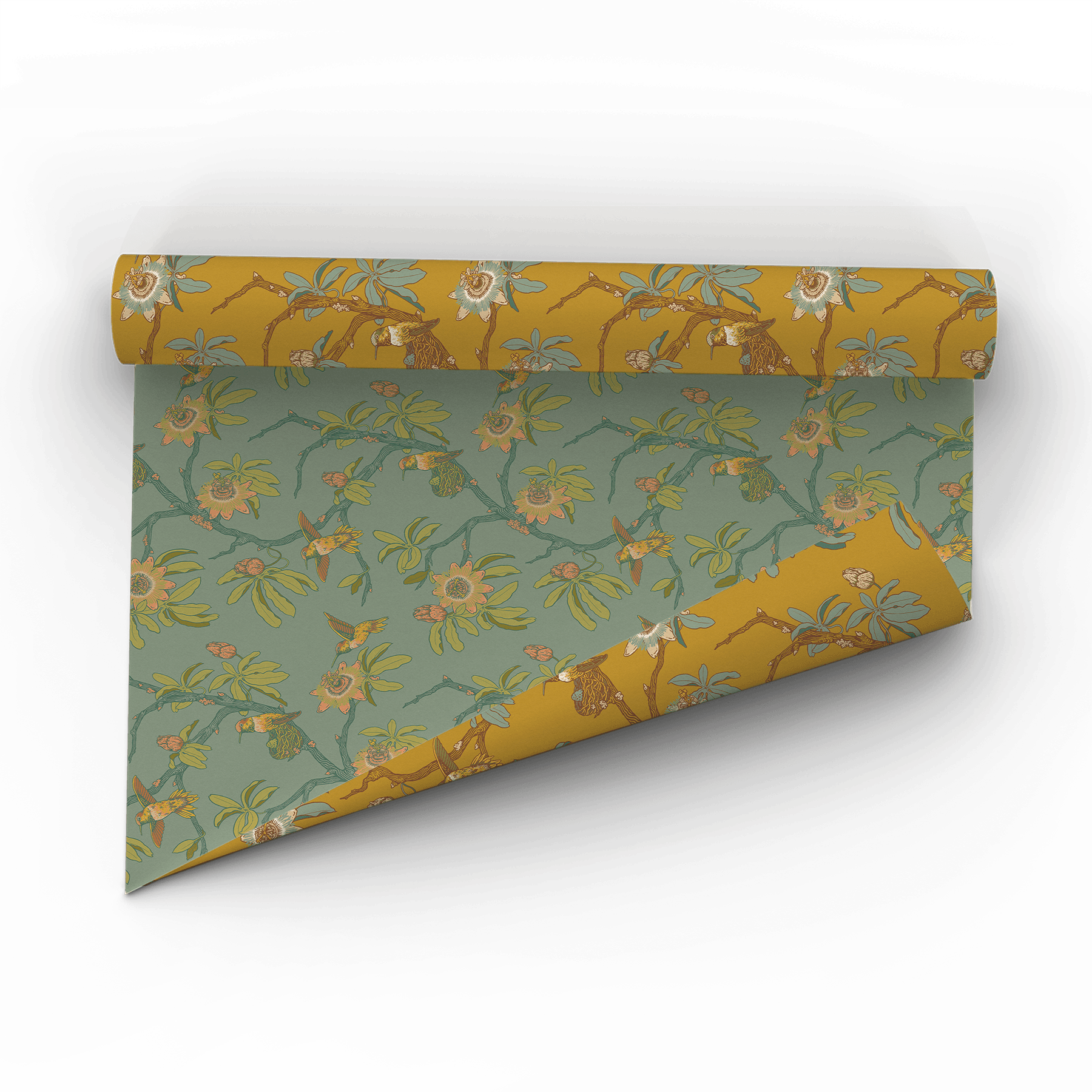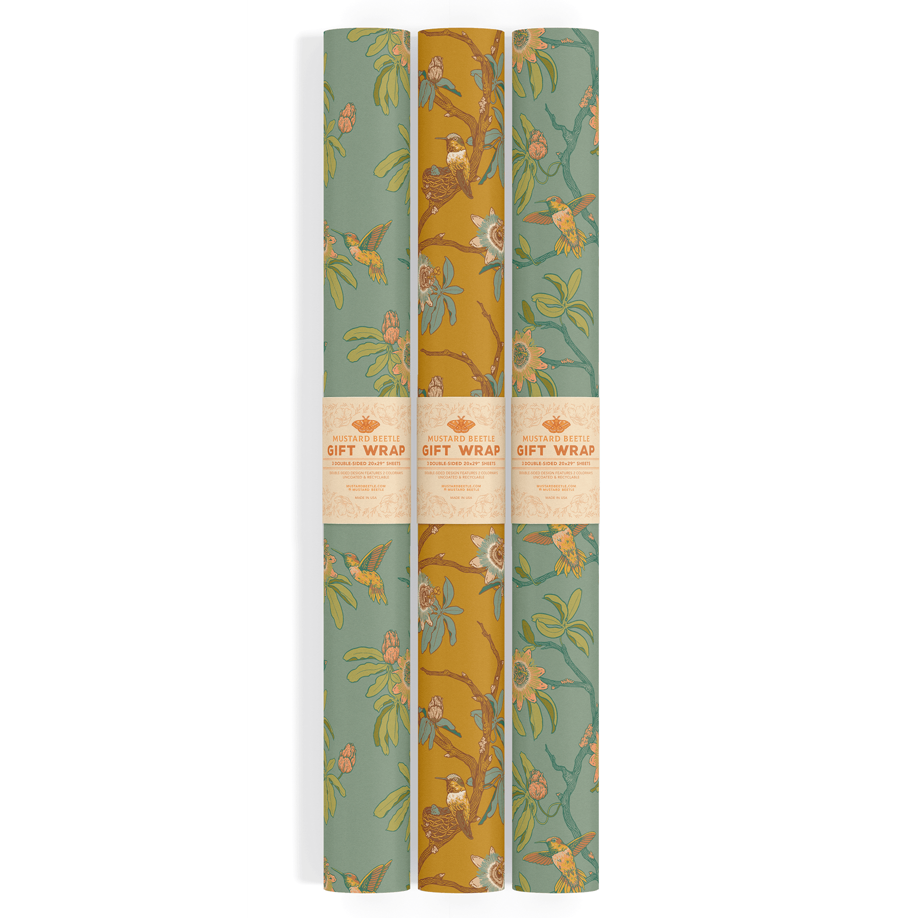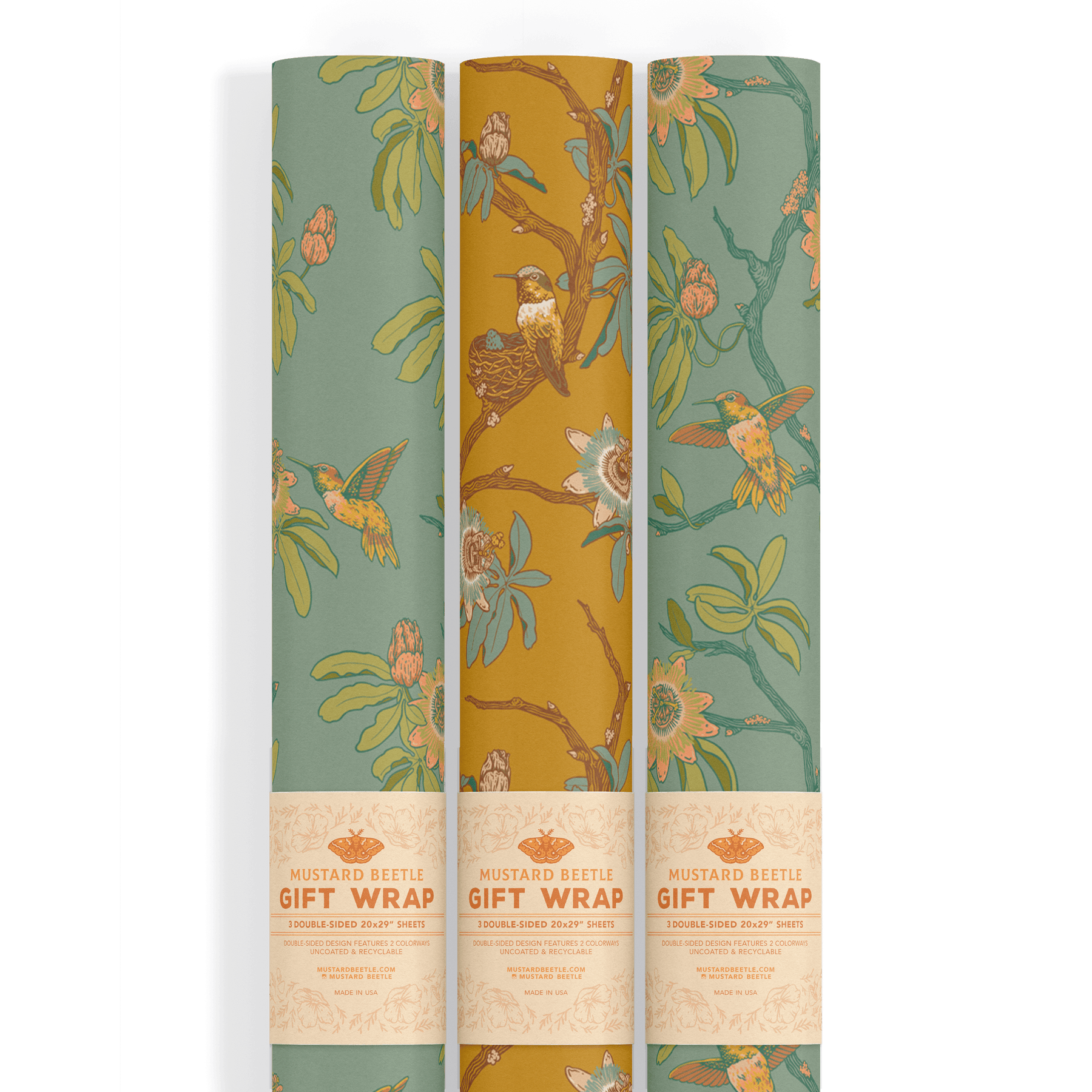 This set of three gift wrap sheets features an original hummingbirds and passionflowers illustration printed on uncoated, recyclable paper. Each 20 by 29 inch sheet offers two unique colorways of the same design to mix and match across gifts.