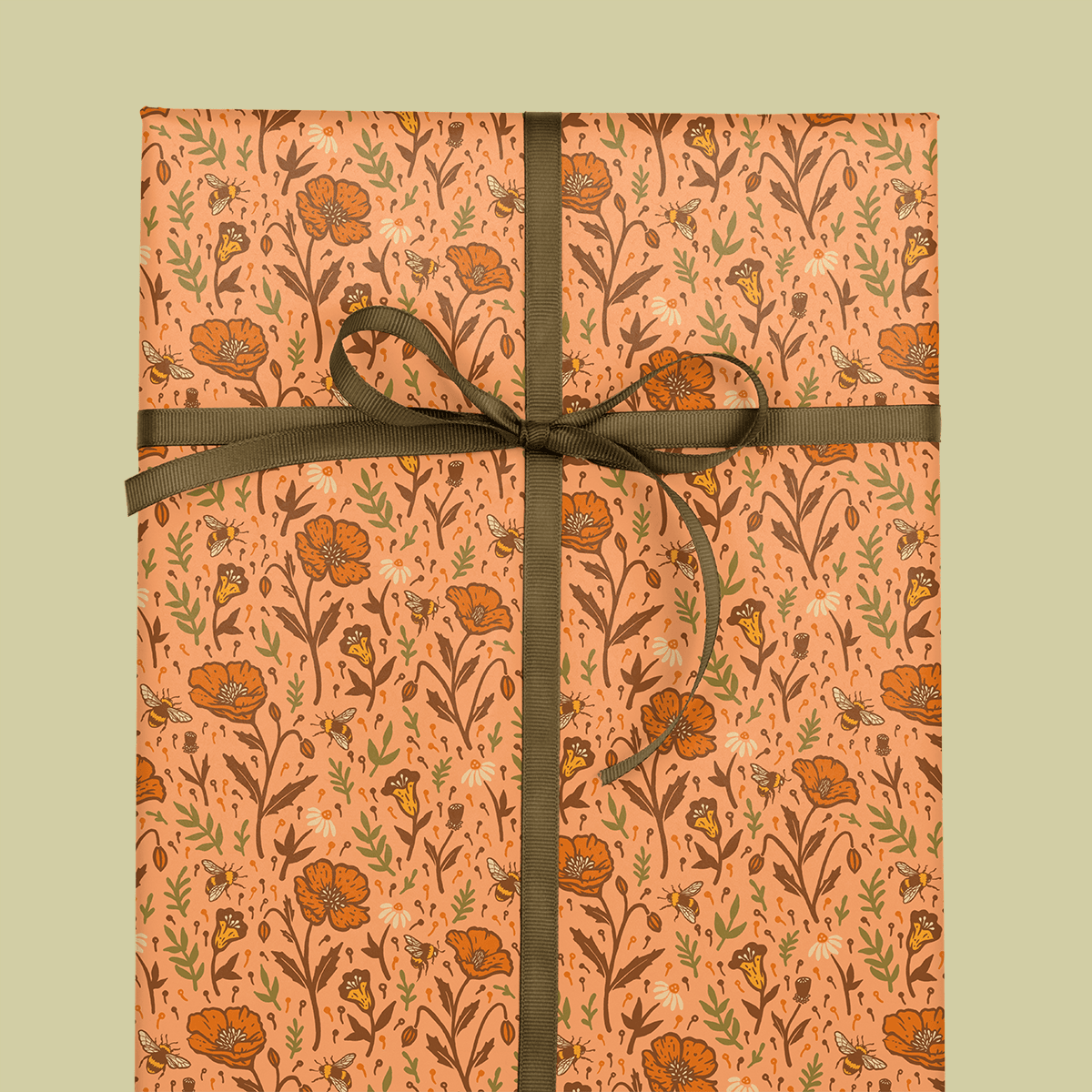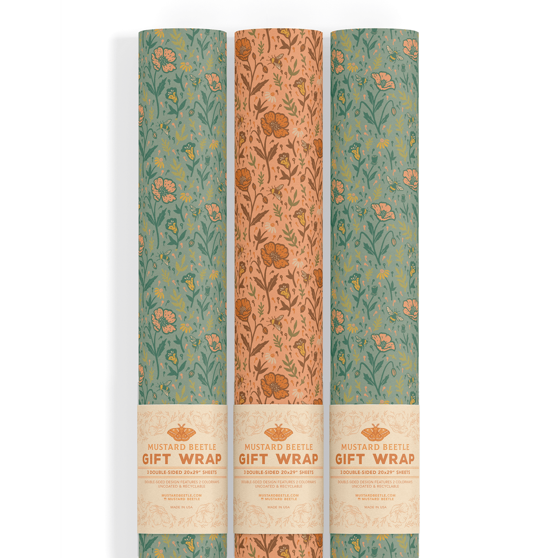 This set of three recyclable gift wrap sheets features an original poppies illustration printed on uncoated, eco friendly paper. Each sheet measures approximately twenty by twenty-nine inches and showcases two unique colorways of the same design for versatile styling.