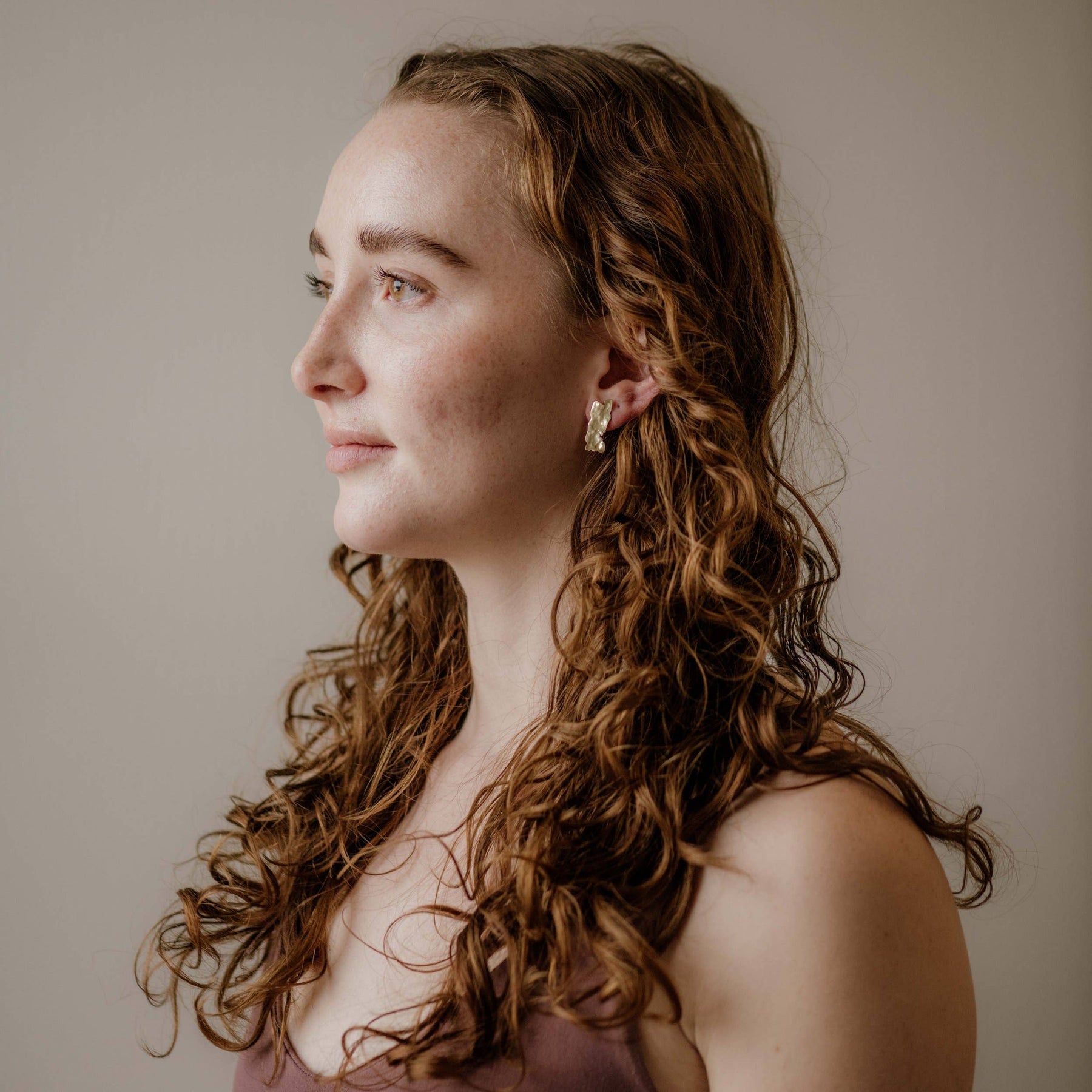 Raw form, refined style. These hand-hammered brass pieces are mounted on sterling silver studs for contrast and comfort. The brass finish carries bold golden undertones. Sculptural and grounded. A study in elemental texture.