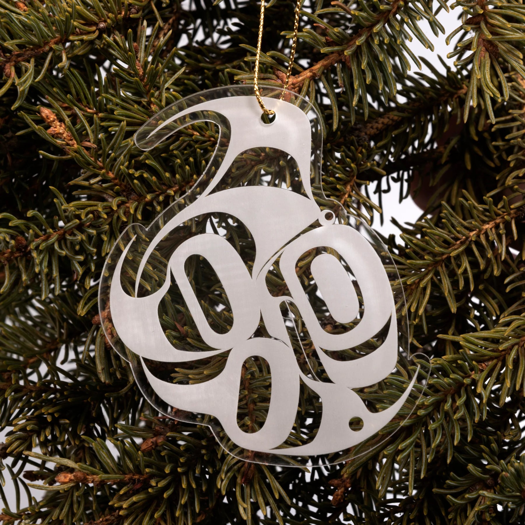 Light catches and dances across these frosted acrylic ornaments, each shaped with Northwest Coast formline artistry by Crystal Worl. Their crisp, translucent finish brings a wintery glow to any tree, while the gold string adds a touch of warmth and elegance.