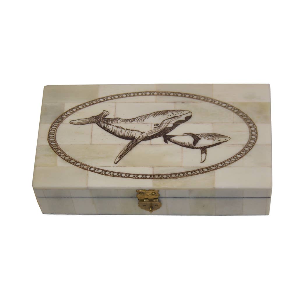 6-1/4" Whale and Calf Scrimshaw Engraved Bone Box