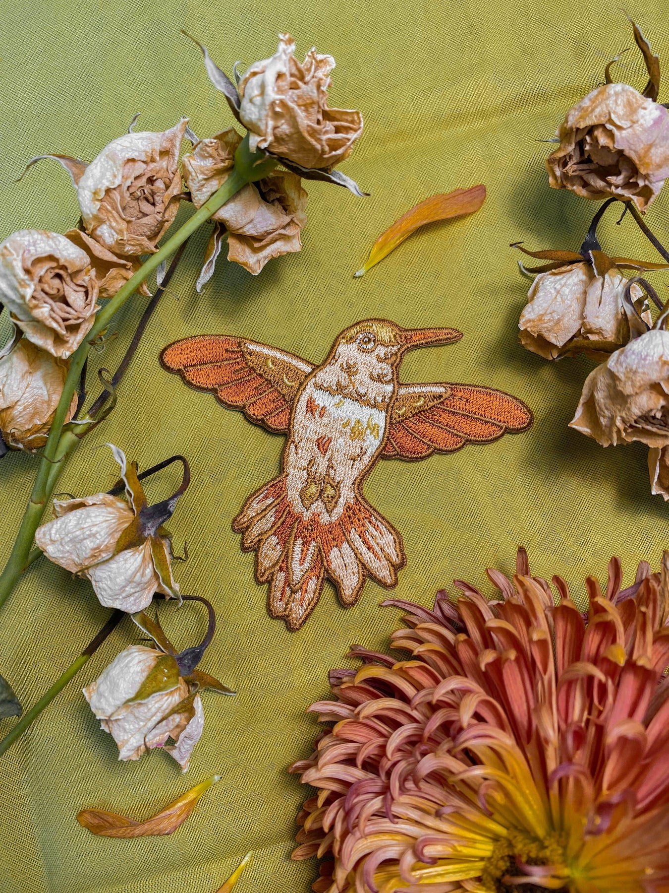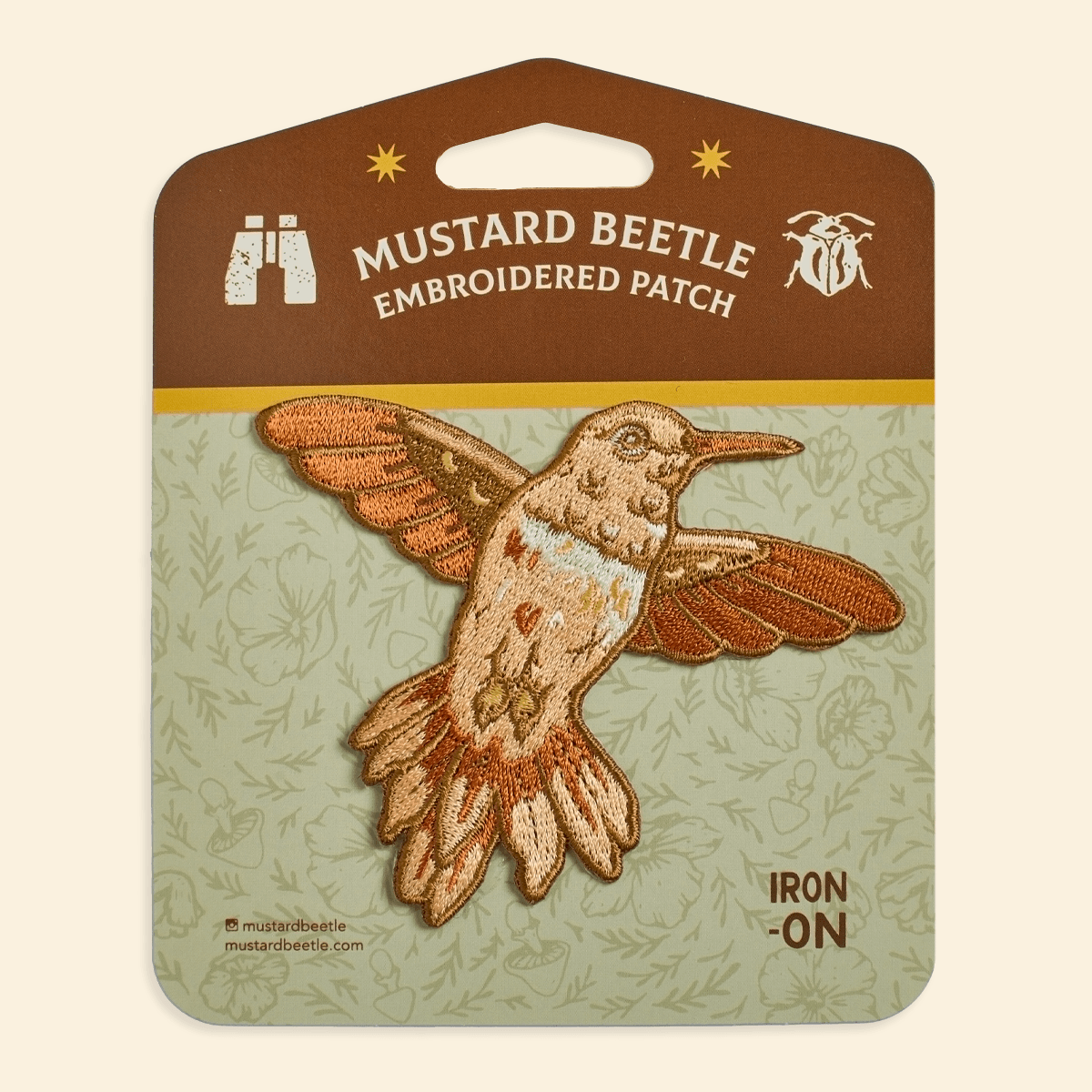This limited edition iron-on embroidered patch showcases an original hummingbird illustration rendered in rich, durable thread. Measuring three by three inches, it applies easily with a household iron and adheres securely to jackets, backpacks, hats and more. Packaged on a backing sheet without cello sleeve, it ships plastic free for an eco friendly touch.