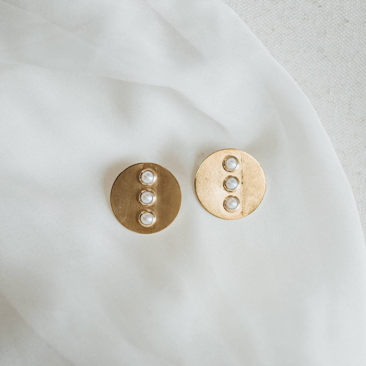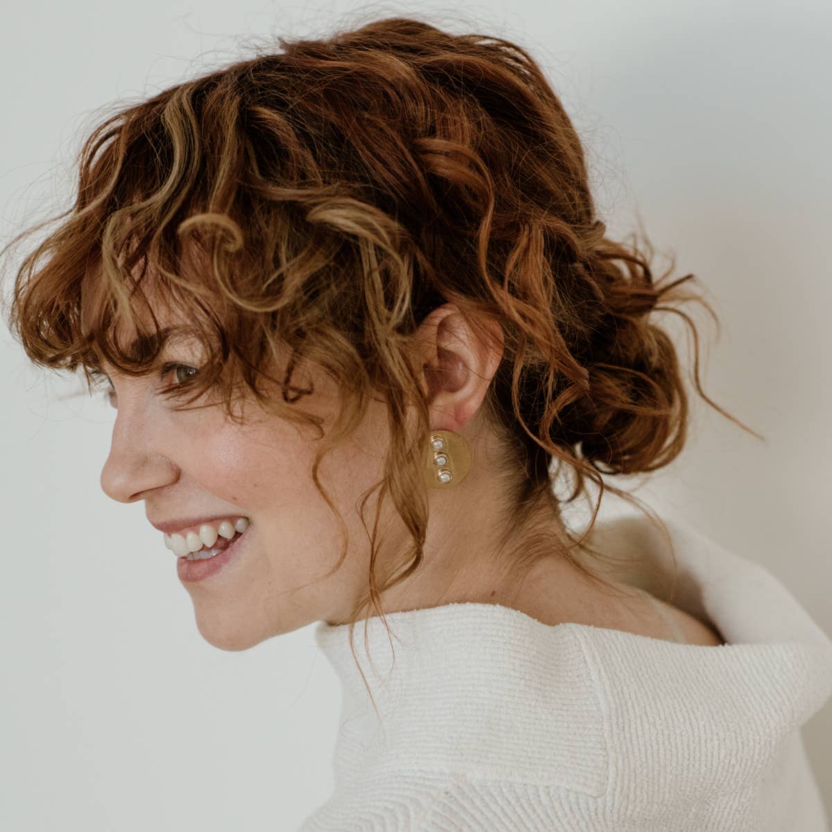 Small but striking. These 4mm freshwater pearls are bezel-set on warm brass or gold-plated bases, with sterling silver posts for all-day comfort. Designed in collaboration with Jasmine Lilly Bridal, they bring a quiet strength and natural elegance to the modern, untamed bride.