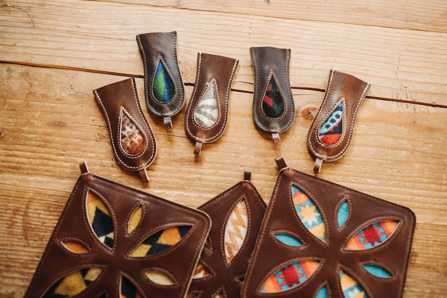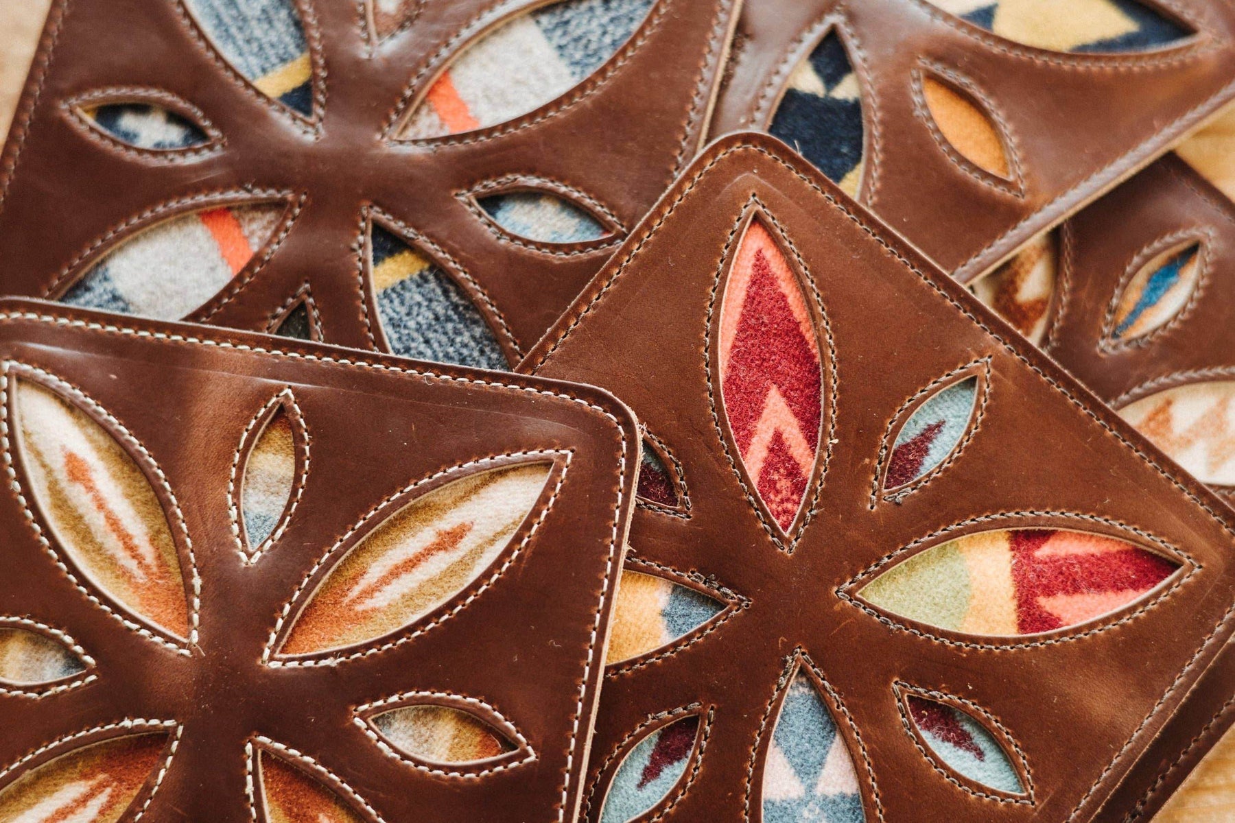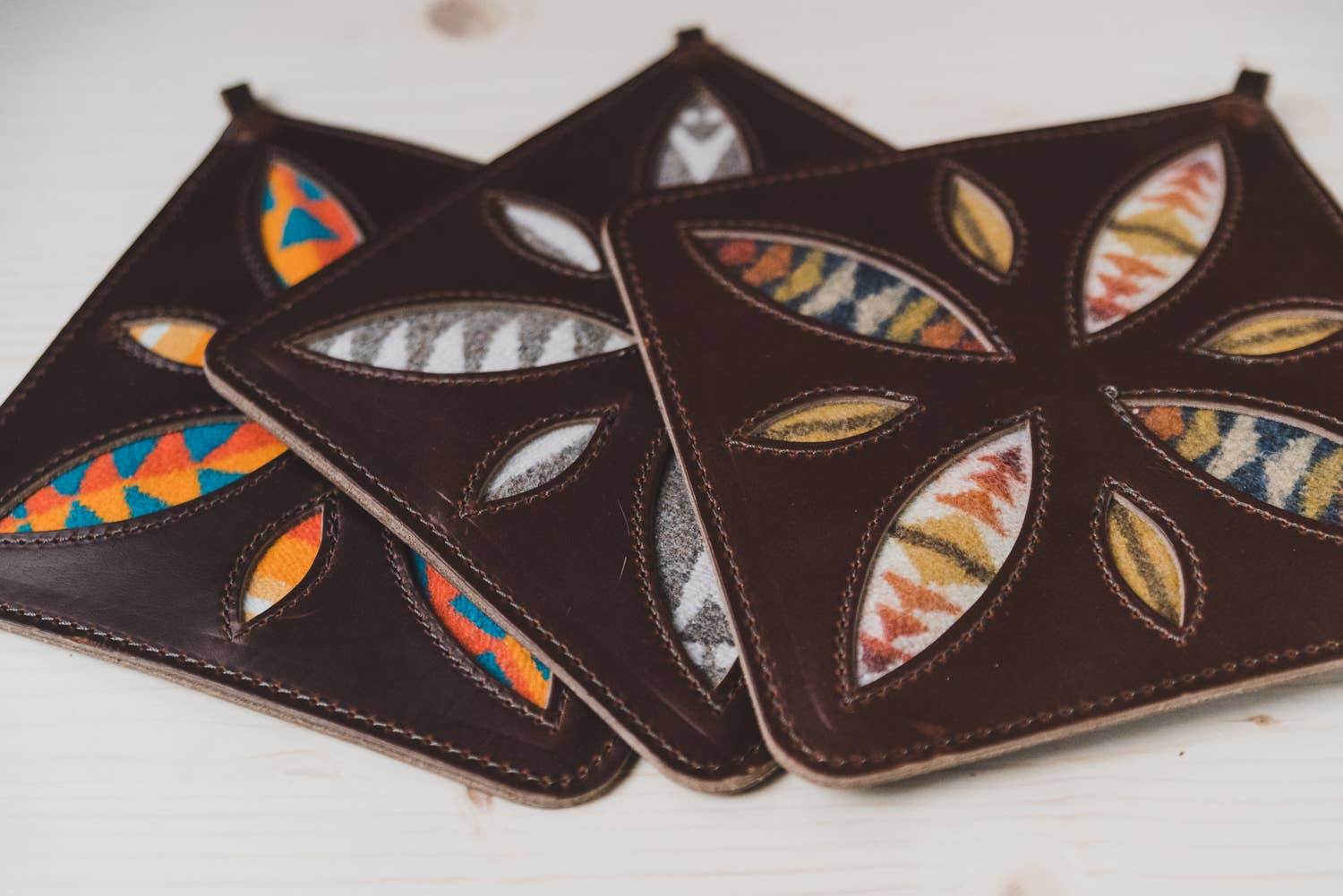 I look great hanging on a nail above the stove but don’t let that fool you. I’m built to work just as hard as I look. Made to be intentionally beautiful and functional, I combine Horween leather with Pendleton wool for durability and style. Measuring about seven inches by seven inches, each piece is unique with wool and leather combinations selected randomly based on current stock.