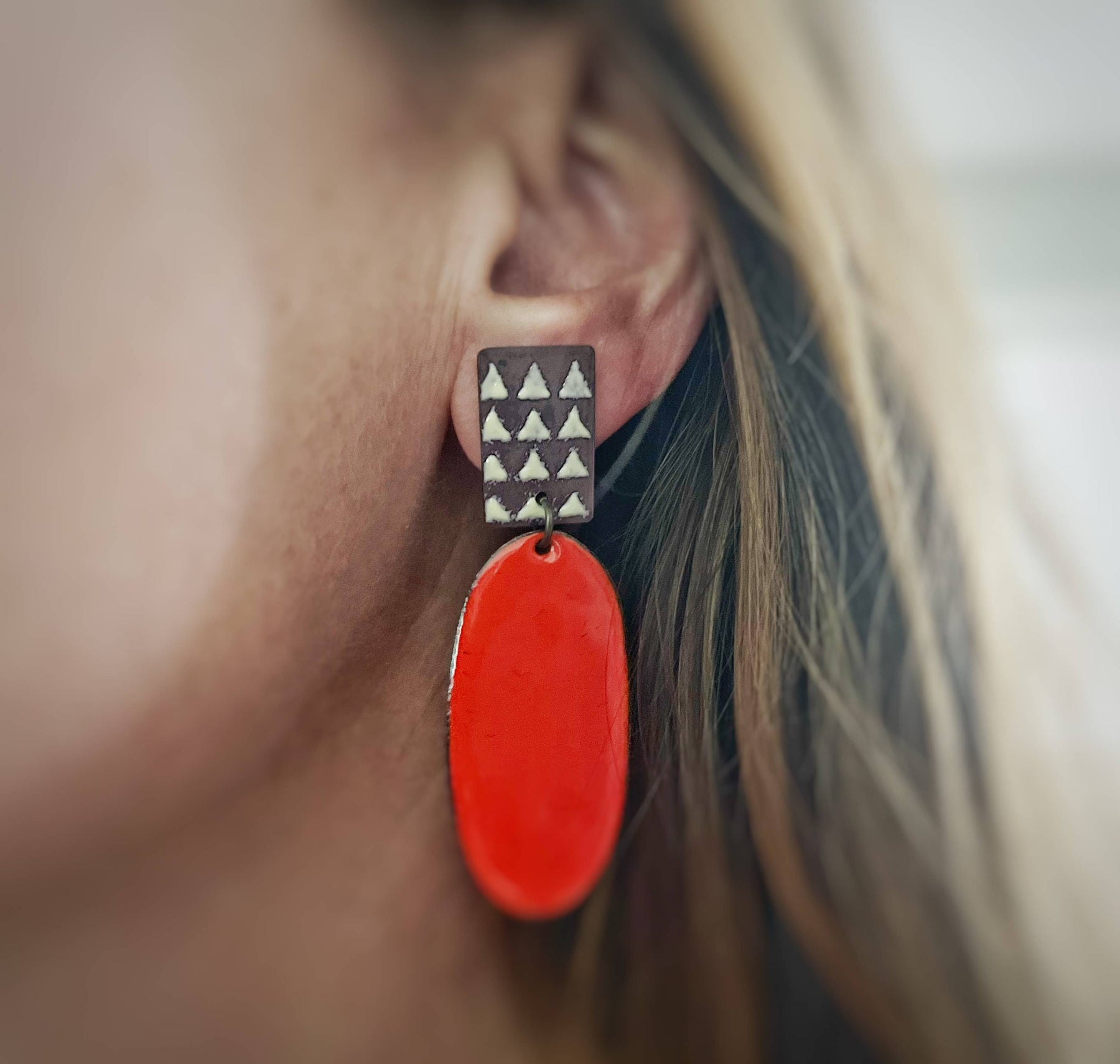 A bold union of warm copper and vivid red enamel gives these earrings a dynamic edge. Elongated copper ovals, coated in rich red enamel, swing gracefully from rectangles adorned with a cream enamel triangle design.